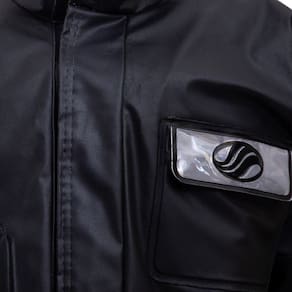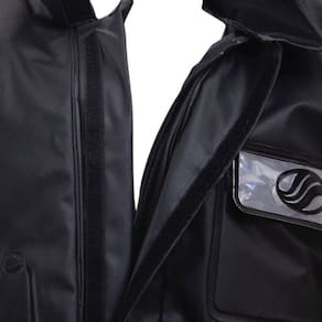 Conjunto Capa de chuva impermeável da linha Europa, em tecido flexível e resistente, oferece liberdade de movimentos e segurança nas manobras. Inclui bolso externo e faixas refletivas nas costas, manga direita e bolso frontal.