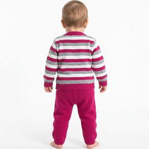 Conjunto Casaco e Calça Tricô Kids Listrado feito em tecido algodão e acrílico, gola redonda, fechamento em botões, manga longa e etiquetas personalizadas.