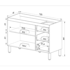 As dimensões estão expressas na seguinte forma - Largura x Altura e Profundidade em cm. O peso suportado considera a carga distribuída igualmente pela peça.