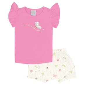 A previsão é de muitas brincadeiras e diversão, então este é o conjunto ideal para aproveitar o dia! As peças deste conjunto são fresquinhas e ideais para garantir todo conforto que sua princesa merece durante as brincadeiras, a blusa é confeccionada em cotton leve trabalhado na cor chiclete e possuí uma borboleta bordada em paetê no peito com escrita “Sou uma linda borboleta e gosto de voar”, já o short é confeccionado em cotton leve na cor off white e possui estampas de borboletas e frutinhas. As peças podem ser usadas separadamente, aumentando ainda mais as composições de looks incríveis para sua pequena.