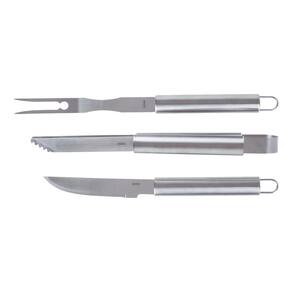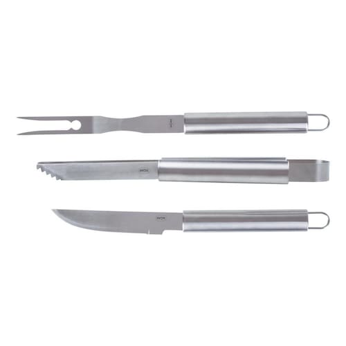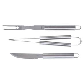 Os amantes de um bom churrasco podem contar com o auxílio do Conjunto Churrasco 3 Peças. Com design funcional, o kit composto por uma faca, um garfo e um pegador proporciona praticidade na hora do preparo de carnes e legumes. Ideal para festas de família, eventos e momentos de lazer.Utilize a faca para cortes precisos de carnes e legumes. Já o pegador é ideal para virar alimentos sobre a grelha com segurança. O garfo, por último, auxilia no manuseio e na firmeza ao cortar peças maiores.Produzido em aço inoxidável, é resistente à corrosão. Além disso, é fácil de limpar e pode ser colocado na lava-louças. Também é prático para guardar: a abertura no cabo faz com que possa ser pendurado, otimizando espaço na cozinha ou área de churrasco. Já os cabos longos garantem mais segurança, já que asseguram maior distância das chamas.