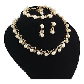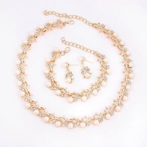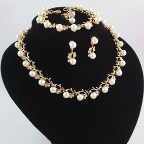 Conjunto colar, brinco e pulseira em pérola sintética com detalhes em strass.Banhado a ouro 18k.Colar com 38cm de comprimento + 10 cm de regulagemPulseira com 16cm de comprimento + 6 cm de regulagemUma linda peça para ser usada nas ocasiões mais importantes de sua vida.Incluso: 01 Colar01 Pulseira01 Par de brincosAcompanha caixa.