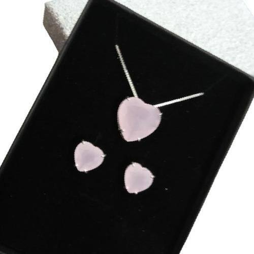 Conjunto Colar e Brinco Coração Pedra Rosa Leitosa F. Prata