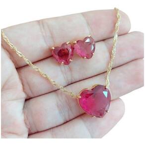 O pingente e os brincos têm formato de coração, que simboliza amor e afeto. O tamanho do pingente é de 1,6 cm e o dos brincos é de 1,0 cm, proporcionando um visual delicado e feminino.