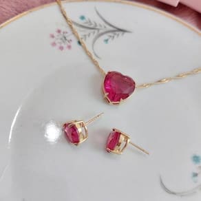 Este Conjunto Colar e Brinco Coração Pedra Vermelho Marsala é perfeito para quem busca uma joia elegante e sofisticada. O conjunto é banhado em ouro 18k, o que confere um brilho único e duradouro.