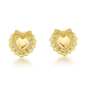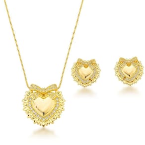Surpreenda com nosso Conjunto de Coração com Laço cravejado em ouro 18K. Símbolo de amor e elegância, é perfeito para qualquer ocasião. Inclui colar e brincos.
