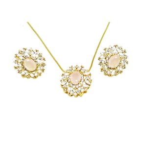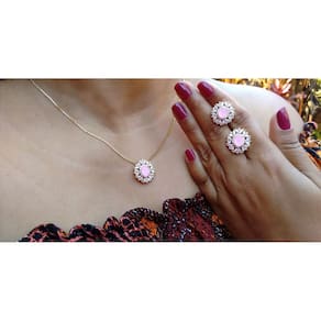 Um Belíssimo Conjunto de Colar e Brincos Folheado a Ouro 18K Com tratamento Antialérgico Com Zircônia Central na Cor Rosa Leitoso com Pequenas Navetes Cristal em Toda Sua Volta Faz Desse Conjunto Inigualável em Beleza e Sofisticação. Ideal para mulheres que amam estar sempre na moda. Os detalhes da zircônia Rosa e os Navetes Cristais dá a essa peça um toque especial de brilho e classe. Dados Técnicos: Marca: Visujóias Corrente: 44 cm Brincos e Pingente: 2 cm Diâmetro com pedra zircônia na cor Rosa no centro e em volta pedras Navetes na cor Cristais. Folheação: Ouro 18k : 6 Meses quanto a folheação e 1 ano para defeitos provenientes de fabricação. Todas as peças possuem tratamento antialérgico Marca: Não Informado