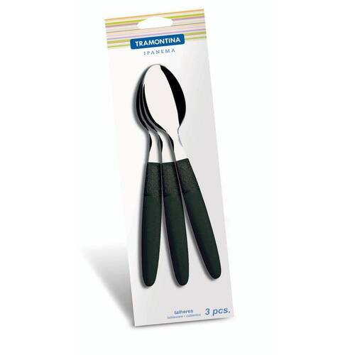 Conjunto Colheres Mesa 3 Peças Ipanema Tramontina 23363300 Os talheres da linha Ipanema são próprios para as refeições diárias. Despojados, têm nas diferentes opções de cores dos cabos de polipropileno o toque de alegria que vai à mesa. As colheres são de aço inox em espessuras que garantem alta resistência e durabilidade. O formato das lâminas impede deformações. Podem ser levados à máquina de lavar. Cor: Preto Marca: Não Informado