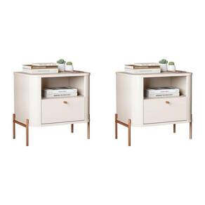 Mesa de cabeceira com os cantos arredondados exclusivos da linha, base e tampo em MDF de 1,5cm, gaveta em MDF de 1,5cm com corrediças telescópicas além dos pés e puxadores em metal com design único e sofisticado. Altura do Conjunto: 48.5 cm Ambiente: null Ambiente Principal: Quarto Cor: Off White/Bronze Informação Complementar: 2x Mesa de Cabeceira Curva 1 Gaveta Pés e Puxadores em Metal 76cm Tucupí OffWhite/Bronze Largura: 45 cm Altura: 48,5 cm Peso: 10,1 kg Profundidade: 33 cm Necessita Montagem: Sim