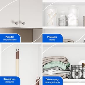 O Conjunto com 3 Armários de Lavanderia Suspenso Multimóveis CR30048 atende de maneira ideal quem busca por organização e um visual bonito na lavanderia. Esse conjunto é composto por três peças versáteis e com ótimo espaço interno. Os aéreos são amplos, um deles possui prateleira, garantindo o armazenamento de seus produtos de limpeza e itens de arrumação com muita acessibilidade. O multiuso é pura praticidade: possui porta única para fácil acesso ao interior do móvel, uma prateleira e gancho para a acomodação de vassoura ou rodo. A caixaria é dos módulos é toda produzida em um aço que passa por rigoroso processo de pintura eletrostática e anticorrosiva - resultando em um acabamento brilhoso e garante durabilidade , e portas em MDP, material de excelente durabilidade e muito fácil de limpar. Essa combinação de materiais é perfeita para trazer resistência aos móveis dispostos em uma área que sofre com intempéries como vento, umidade e água, como é lavanderia.