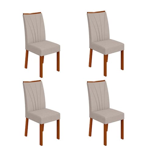 Que tal o Conjunto com 4 Cadeiras Apogeu? Sua sala de jantar dos sonhos está a um Conjunto Apogeu de distância! Com 4 cadeiras, o kit tem o bem-estar perfeito para o dia a dia, graças ao assento e ao encosto estofados em espuma e revestidos em tecido de toque agradável - a estrutura clássica ainda ajuda na receptividade, pois recebe bem o corpo. Por falar em clássico, a cor neutra e o amadeirado se unem num combo primoroso para encher de sofisticação sua casa - notou o detalhe na parte superior do encosto? Além de embelezar o ambiente, ele auxilia a puxar e recolher as cadeiras ;) Marca: Não Informado