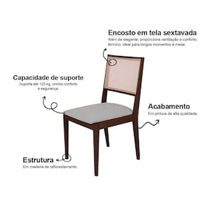 O assento conta com espuma de alta densidade D26, que oferece firmeza e conforto na medida certa, além de suportar até 120 kg com total segurança. O design com linhas retas e acabamento refinado permite que a cadeira se adapte facilmente a diferentes estilos de decoração, do clássico ao contemporâneo.