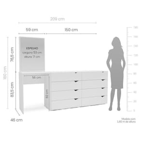 1x Cômoda Penteadeira 8 Gavetas com Espelho Porto Branco Largura: 209 cm Altura: 160 cm Peso: 62 kg Profundidade: 46 cm Necessita Montagem: Sim