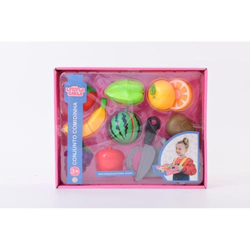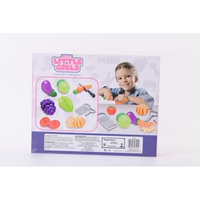 O Conjunto Comidinha, Mini Little Girls vem com frutas e utensilios de cozinha de brinquedo para fazer a brincadeira de faz de conta mais realista