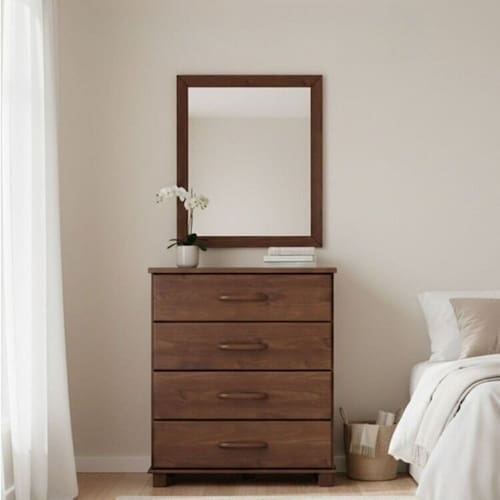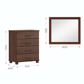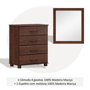 A cômoda possui 4 gavetas com corrediças telescópicas, puxadores e pés em madeira maciça, acabamento em verniz PU/UV acetinado na cor Café. Seu design rústico e estrutura robusta garantem durabilidade e elegância. O espelho complementa o conjunto com moldura em madeira maciça e estilo clássico, ideal para compor ambientes sofisticados com funcionalidade. Juntos, oferecem beleza, organização e alto padrão em um só combo. Possui Portas: Não Suporta Até (kg): 30 kg Possui Rodízio: Não Altura do Conjunto: 101.5 cm Ambiente: null Ambiente Principal: Quarto Cor: Café Informação Complementar: 1x Cômoda 4 Gavetas 100% Madeira Maciça Linha Ouro Café Largura: 84,2 cm Altura: 101,5 cm Peso: 28,3 kg Profundidade: 49 cm Necessita Montagem: Sim