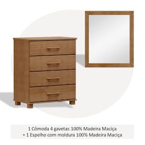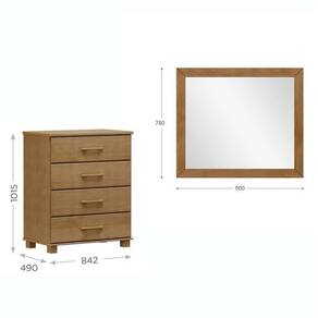 A cômoda possui 4 gavetas com corrediças telescópicas, puxadores e pés em madeira maciça, acabamento em verniz PU/UV acetinado na cor Freijó. Seu design rústico e estrutura robusta garantem durabilidade e elegância. O espelho complementa o conjunto com moldura em madeira maciça e estilo clássico, ideal para compor ambientes sofisticados com funcionalidade. Juntos, oferecem beleza, organização e alto padrão em um só combo. Possui Portas: Não Suporta Até (kg): 30 kg Possui Rodízio: Não Altura do Conjunto: 101.5 cm Ambiente: null Ambiente Principal: Quarto Cor: Freijó Informação Complementar: 1x Cômoda 4 Gavetas 100% Madeira Maciça Linha Ouro Freijó Largura: 84,2 cm Altura: 101,5 cm Peso: 28,3 kg Profundidade: 49 cm Necessita Montagem: Sim
