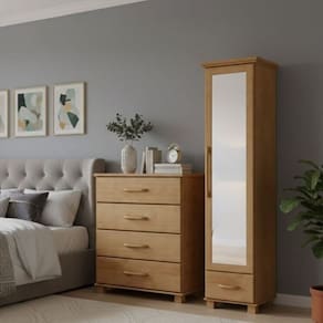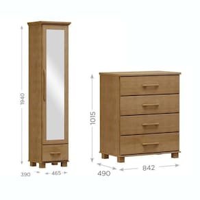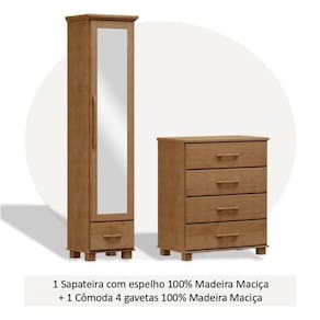 Este combo da linha Ouro da Finestra Móveis reúne uma cômoda com 4 gavetas amplas e uma sapateira vertical com espelho embutido, 1 porta e 1 gaveta. Ambos os móveis são fabricados em madeira maciça de pinus com acabamento em verniz PU/UV na cor Freijó, garantindo durabilidade, resistência e um visual elegante. Possui Rodízio: Não Altura do Conjunto: 194 cm Ambiente: null Ambiente Principal: Quarto Cor: Freijó Informação Complementar: 1x Cômoda 4 Gavetas 100% Madeira Maciça Linha Ouro Freijó Largura: 84,2 cm Altura: 101,5 cm Peso: 28,3 kg Profundidade: 49 cm Necessita Montagem: Sim
