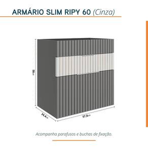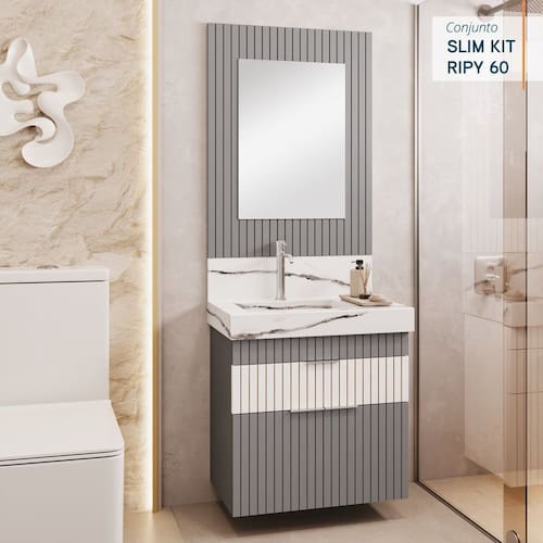 O CONJUNTO é composto por ARMÁRIO ESPELHO LAVATÓRIO. ARMÁRIO fabricado em MDP PF (15mm), com ripas AUTÊNTICAS de HDF BP (06mm), na largura de 20mm. Puxadores em alumínio anodizado, gaveta com divisor e higiênico organizador dental (removível e lavável), corrediças telescópicas e portas com dobradiças slow, ou seja, com sistema amortecedor. LAVATÓRIO fabricado em porcelanato técnico polido, com baixíssima absorção de umidade, resistente a riscos e manchas. Possui frontão frontal e frontão lateral. Cuba esculpida em porcelanato. Acompanha VÁLVULA na cuba, para escoamento d'água. ESPELHO lapidado, estruturado em painel com ripas de HDF BP (06mm). Acompanha parafusos buchas de nylon para fixação na parede. Não acompanha torneira. Possui manual de instalação. Acabamento da Gaveta: BP Acabamento da Porta: Acetinado Acompanha Cuba: Não Acompanha Manual de Instalação: Sim Acompanha Parafusos Para Fixação Na Parede: Sim Acompanha Tampo: Não Altura do Espelho: 80 cm Ambiente Principal: Banheiro codigo_ean: 7909903931530 Cor: Cinza Cor do Produto: Cinza Cor Interna: Cinza Escala de Brilho: Acetinado Espessura do Espelho: 3 mm Formato do Espelho: Retangular Furação para Cuba e Torneira: Sim Gaveta com Chave: Não Informações Complementares: Produto sai montado de fábrica, devidamente regulado, bastando apenas fixá-lo na parede. Itens Inclusos: 01 Gabinete; 01 Lavatório; e 01 Espelho Largura do Espelho: 60 cm Linha ou Coleção: Ripy Manual de Montagem e Instalação: https://product-hub-prd.madeiramadeira.com.br/949255/documents/b7500a9e-06c8-45d0-8522-976b4baad2062361113348617268419218121.pdf Material da Gaveta: MDF/MDP Material da Porta: MDF/MDP Material do Puxador da Gaveta: Alumínio Anodizado Material do Puxador da Porta: Alumínio Anodizado Medida da Espelheira (A x L x P): 80 x 60 x 1,5 Medida do Gabinete (A x L x P): 58 x 57,8 x 34,4 Necessita Montagem: Não Origem do Produto: Nacional Peso: 30 kg Peso Máximo por Gaveta: 3 kg Possui Espelheira: Sim Possui Gabinete: Sim Possui iluminação: Não Possui Nichos: Não Possui Pés: Não Possui Porta de Vidro: Não Possui Recorte No Tampo Para Cuba: Não Possui Rodízio: Não Possui Sifão: Não Possui Tampo: Não Produto Montado: Não Recomendações de Uso, Manutenção e Limpeza: Nunca utilizar produtos químicos. Use somente flanela levemente umedecida em água e em seguida uma outra seca e macia. Caso ocorra vazamento ou acúmulo de água no produto, enxugar imediatamente. Suporta Até (kg): 10 kg Suporte para Toalheiro: Não Tamanho do Espelho (A x L): 80 x 60 Tipo de Corrediça da Gaveta: Metálica Telescópica Tipo de Dobradiça/Corrediça da Porta: Com Amortecedor Tipo de Fixação do Espelho: Parafusos Tipo de Porta: Abrir Tipo de Puxador da Gaveta: Externo Tipo de Puxador da Porta: Externo