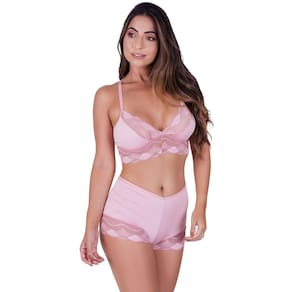 O conforto e a delicadeza que toda mulher merece! Sutiã sem bojo e sem arco em tecido e renda de poliamida em parte do busto em toda a pala, sua elasticidade facilita vestir a peça já que não tem abertura. As alças com regulagem de altura em metal são cruzadas no pescoço, ideal para usar com blusas ou vestidos de costas seminuas. Calcinha estilo caleçon em tecido e renda de poliamida nas barras das pernas e viés na cintura.