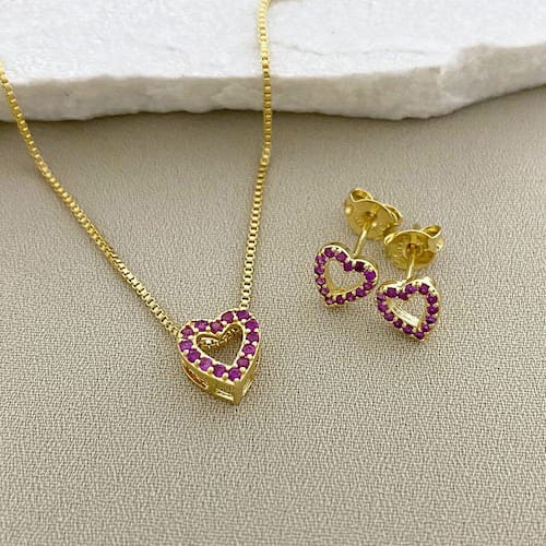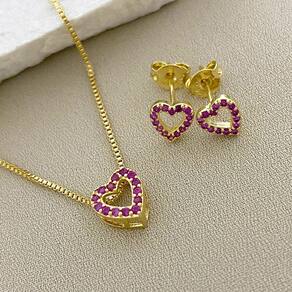 Conjunto Coração Cravejado com Zircônia Colorida Banhado a Ouro