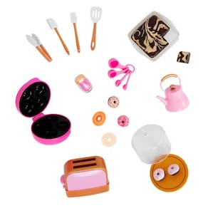 Além disso, o Conjunto de Cozinha com Chaleira - Our Generation vem com diversos acessórios, como uma espátula, colheres medidoras, pincel e pote de granulado. Com eles, suas bonecas podem preparar sobremesas deliciosas e surpreender os convidados. A bandeja de brownie possui uma peça removível, facilitando na hora de servir. E a máquina de donuts faz quatro donuts coloridos que cabem perfeitamente na bandeja de sobremesas.