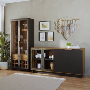 Com design minimalista, a Cristaleira Guanabara é uma ótima escolha. Desenvolvida para armazenar e organizar utensílios de louças, possui duas prateleiras de vidro, iluminadas por fitas de led, que são ideais para destacar e valorizar sua coleção de taças ou copos especiais. Além disso, possui uma adega com espaço para 10 garrafas e uma gaveta interna para guardar travessas e aparelhos de jantar.