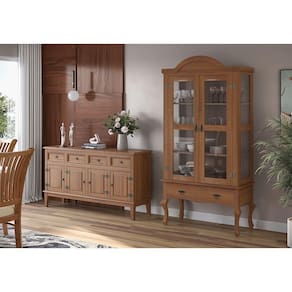 Beleza e Elegância: O design clássico da Cristaleira Luis XV e a robustez do Balcão de Madeira Maciça 4 Portas e 4 Gavetas conferem um toque de sofisticação a qualquer ambiente.