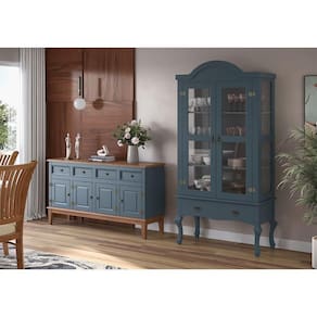 Beleza e Elegância: O design clássico da Cristaleira Luis XV e a robustez do Balcão de Madeira Maciça 4 Portas e 4 Gavetas conferem um toque de sofisticação a qualquer ambiente.