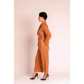 Conjunto Cropped Calça Jaque, a blusa possui mangas longas com ombreiras, detalhe de sobreposição que lembra um colete, possui bolsos duplos e falsos. Decote em V com lapela e cordas do mesmo tecido para amarração. Calça de cintura alta com fechamento frontal em zíper e bolsos laterais. O conjunto do cropped de manga longa e a calça de cintura alta é elegante e versátil, além de dar a impressão de que o corpo é mais alto e esbelto. Código do Produto: 2100002016585 Marca: Khalli