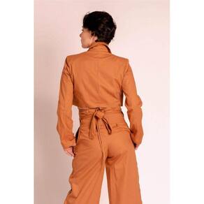 Conjunto Cropped Calça Jaque, a blusa possui mangas longas com ombreiras, detalhe de sobreposição que lembra um colete, possui bolsos duplos e falsos. Decote em V com lapela e cordas do mesmo tecido para amarração. Calça de cintura alta com fechamento frontal em zíper e bolsos laterais. O conjunto do cropped de manga longa e a calça de cintura alta é elegante e versátil, além de dar a impressão de que o corpo é mais alto e esbelto. Código do Produto: 2100002016585 Marca: Khalli