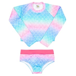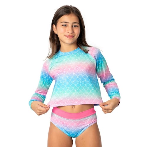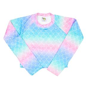 O Conjunto Praia Infantil Cropped multicolorido com estampa de escamas de sereia é perfeito para as meninas aproveitarem os momentos ao sol, seja na praia ou piscina. A calcinha possui barrado rosa na cintura, que realça o modelo e o look. Possui Proteção UV 50+ para máxima segurança contra os raios solares.