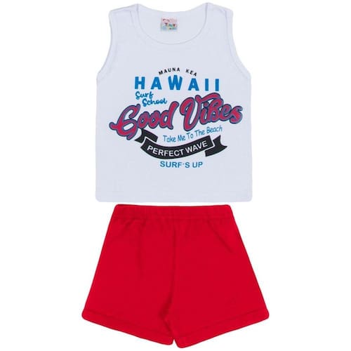 contém: - 1 conjunto curto com camiseta regata branca estampada good vibes e shorts em moletinho vermelho liso.