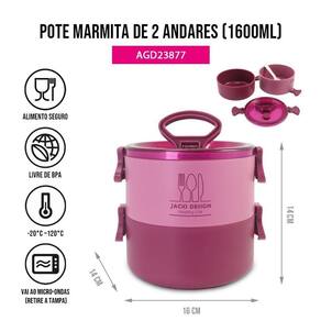 Agora ficou mais fácil organizar seus alimentos para um dia longo. A marmita de 1400 ml possui 2 recipientes que encaixa um em cima do outro, acompanha garfo e é prático e simples. Feito de material polipropileno, é resistente e possui tampa com travas para segurança evitando acidentes. Produto livre de BPA com qualidade Jacki Design. Conheça a linha completa da coleção JOY e complete o seu kit! (INSTRUÇÕES DE USO: Retire a tampa antes de levar ao micro-ondas; usar somente para aquecer comida, não para cozinhar; Vai ao freezer e lava-louças; Temperatura de uso: -20C ~120C; Limpe usando uma esponja macia e detergente.)