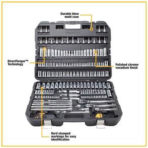 Conjunto de ferramentas mecânicas tem anel de controle serrilhado Ferramentas mecânicas apresentam tecnologia DirectTorque O conjunto de ferramentas mecânicas DEWALT tem acabamento em cromo vanádio polido Conjunto de chaves combinadas vem com estojos empilháveis com fechadura O padrão de marca de hash estampado na alça do conjunto de chaves combinadas SAE fornece pontos de aderência adicionais. O design do painel mais longo oferece mais torque durante o uso Marca: Não Informado