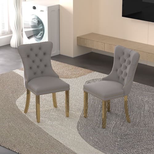 Detalhes do produto Conjunto de cadeiras de jantar de veludo moderno. Estofadas em veludo rico com encosto tufado e acabamento artesanal em cabeça de prego, essas cadeiras trazem estilo e conforto ao seu espaço. As pernas de aço inoxidável adicionam durabilidade e um toque de luxo. Com almofadas de espuma de alto rebote e uma estrutura de suporte elástica tripla, elas oferecem conforto duradouro. Medindo 24,60" x 19,70" x 37,50", eles se encaixam perfeitamente na maioria das áreas de jantar e são fáceis de montar. Estofamento de veludo luxuoso: as cadeiras são estofadas em veludo rico, proporcionando um toque suave e elegante à sua sala de jantar. O encosto tufado adiciona um elemento de design clássico que combina bem com a decoração moderna. Pernas prateadas duráveis: as pernas de aço inoxidável são banhadas a ouro, dando às cadeiras uma aparência sofisticada e garantindo uma base resistente e durável. Perfeito para adicionar um toque glamoroso a qualquer sala de jantar. Conforto superior: com almofadas de espuma de alto rebote apoiadas por elásticos e molas de aço, essas cadeiras oferecem conforto duradouro, tornando-as ideais para jantares prolongados ou reuniões familiares. Acabamento elegante em cabeça de prego: o acabamento decorativo feito à mão ao longo das bordas adiciona um detalhe refinado que aprimora o apelo luxuoso da cadeira, combinando o charme clássico com o estilo contemporâneo. Robusto e estável: a base é feita de 4 pernas de metal de alta qualidade que garantem boa robustez e durabilidade. Observe a distinção entre as pernas dianteiras e traseiras. Colocamos todas as pernas embaixo do assento.