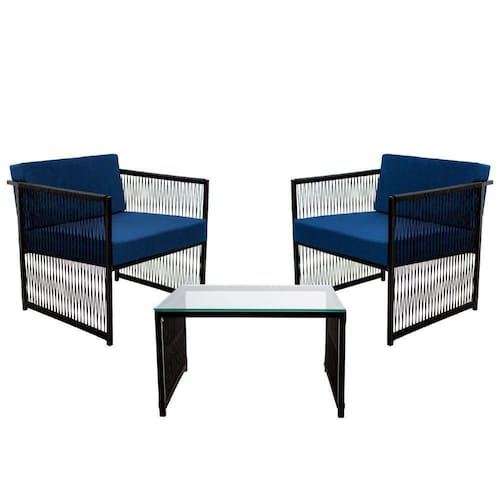 Conjunto De 2 Poltronas Em Fibra Sintética E Mesa De Centro Azul O Conjunto de 2 Poltronas Santiago e Mesa de Centro e perfeita para transformar qualquer ambiente em um espaco acolhedor e sofisticado. Composto por duas poltronas e uma mesa de centro, com um tampo de vidro de 60x60, proporcionando um toque moderno e pratico. As poltronas e a mesa de centro sao confeccionados com estrutura em Aco Carbono, oferecendo robustez e durabilidade. Com acabamento em Fibra Sintetica confere uma estetica refinada, destacando-se pela sua resistencia e versatilidade em se adaptar a diversos estilos de decoracao. Os assentos das poltronas sao estofados com material Impermeavel e espuma D28 no estofamento proporciona um conforto excepcional. Este conjunto oferece uma combinacao unica de estilo, conforto e durabilidade.