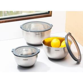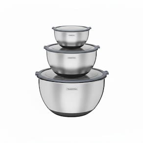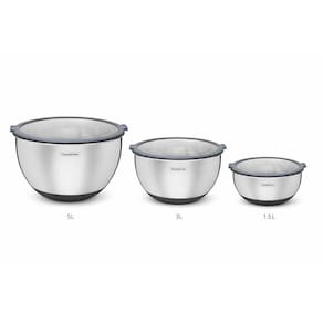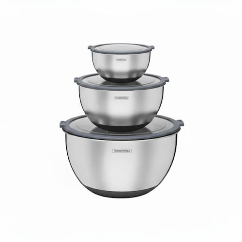 O Conjunto de 3 Bowls Tramontina Cucina em Aço Inox com Tampa é um kit indispensável para qualquer cozinheiro que busca praticidade, qualidade e organização na cozinha. Fabricado em aço inoxidável de alta qualidade, oferece alta durabilidade, resistência e higiene, além de ser fácil de limpar e não reter odores ou resíduos, garantindo a conservação ideal dos alimentos no dia a dia. As tampas transparentes com vedação hermética proporcionam fechamento seguro, mantendo o frescor e a qualidade dos alimentos por mais tempo, com a praticidade de visualizar o conteúdo interno sem a necessidade de abrir. A base de silicone antiderrapante oferece maior estabilidade durante o preparo das receitas, evitando deslizamentos e trazendo mais segurança e conforto no uso. Versátil e funcional, o kit é ideal para preparar, servir e armazenar alimentos, atendendo diferentes necessidades na cozinha. O conjunto conta com 1 Bowl Tramontina de 5 L, 1 Bowl Tramontina de 3 L e 1 Bowl Tramontina de 1,5 L, tornando sua rotina muito mais prática e eficiente.