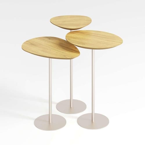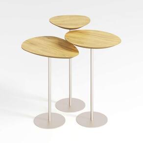 Estrutura em aço carbono com acabamento em pintura eletrostática de alta resistência na cor Champanhe. Tampo com formato orgânico em MDF de 15 mm usinadas com acabamento em verniz UV fosco texturizado. O conjunto é composto de três mesas de apoio nas medidas abaixo.