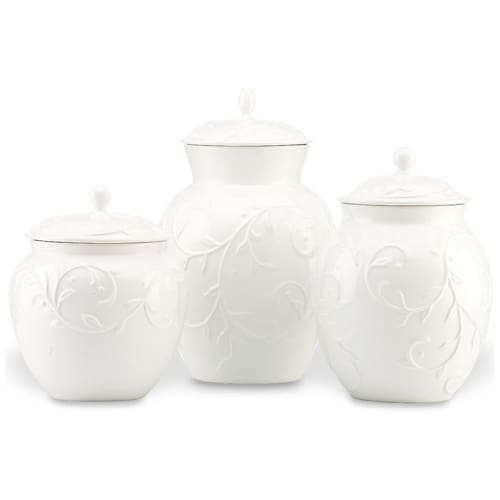 Descrição: Adicione um toque de elegância à sua cozinha com este conjunto de potes esculpidos da Lenox. Projetados com um acabamento em porcelana branca sofisticada, esses potes são perfeitos para armazenar seus ingredientes favoritos ou para servir em ocasiões especiais.