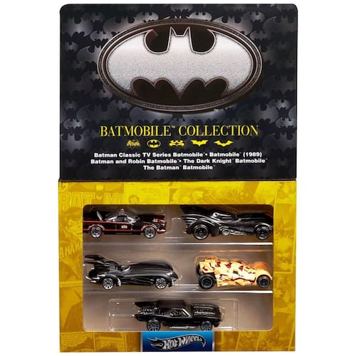 Celebre o 85º aniversário do Batman com um conjunto de 5 carros representando a evolução do Batmóvel. Este conjunto destaca a transformação do veículo principal do Batman, desde os primeiros dias na série de TV até o modelo mais recente do filme THE BATMAN. Cada carro de metal fundido é em escala 1:64 com detalhes exclusivos e rodas especiais, e um dos veículos possui fundição em zinco. O conjunto vem em uma embalagem comemorativa própria, perfeita para exibição. Cores e decorações podem variar. Mostre a evolução do Batmóvel com um conjunto de 5 veículos em comemoração ao 85º aniversário do Batman. Cada Batmóvel de metal fundido no conjunto é em escala 1:64 e apresenta detalhes exclusivos e rodas especiais. Um deles possui fundição em zinco. Inclui o Batmóvel da Série Clássica de TV do Batman, o Batmóvel de Batman Eternamente, o Batmóvel de Batman e Robin, o Batmóvel da Trilogia O Cavaleiro das Trevas e o Batmóvel de The Batman. O conjunto vem em embalagem própria de 85º aniversário para aumentar a colecionabilidade. Perfeito para brincar ou exibir, este conjunto de 5 carros é um item essencial para qualquer fã do Cavaleiro das Trevas.