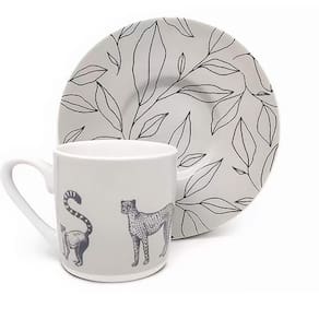 Xícara na Cor branca com estampa de animais da selva e folhas em azul, um charme. A Porcelana é altamente durável, higiênico, de fácil limpeza. Resistentes ao micro-ondas e máquina de lavar louças.