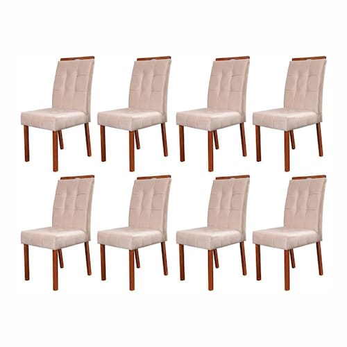 Surreal, não é mesmo? O Conjunto de 8 cadeiras em Madeira Maciça e Estofada Sophia Authentic traz um toque de elegância e sofisticação na sua sala de jantar, deixando o ambiente muito agradável. Os conjuntos de cadeiras tem sua estrutura 100% em Madeira Maciça, Assento e Encosto estofado Premium em D-16 e D-18 e já vão 100% montadas, facilitando ainda mais. Com acabamento impecável em verniz, tem como essência a robustez e naturalidade ao mesmo tempo. Possui uma estrutura mega resistente e uma durabilidade acima da média. É realmente uma preciosidade em forma de móvel! Acabamento: Verniz Acabamento da Estrutura: Verniz Almofada do assento: Fixa Altura do assento até o chão: 0,99 cm Altura dos Pés: 0,47 cm Ambiente Principal: Sala de Jantar Cor: Champagnhe/Marfim Cor do Produto: Champagnhe/Marfim Cor dos Pés: Marrom Dimensões do assento: 44 x 44 Dobrável: Não Enchimento do Assento: Espuma D-18 Enchimento do Encosto: Espuma D-16 Escala de Brilho: Semi-Brilho Estrutura do Assento: Madeira Maciça Estrutura do Encosto: Madeira Maciça Estofada Giratória: Não Informações Complementares: - Todas as nossas estruturas são 100% de madeira Maciça Eucalipto- Assentos e Encostos estofados com couro sintético alto padrão, Linho Premium, Rattan de Fibra 100% Natural e Fibra- Cadeiras suportam 120 kg- Todas as cadeiras vão 100% montadas- O nosso R Itens Inclusos: Conjunto de 8 cadeiras em Madeira Maciça e Estofada Sophia Authentic Linha ou Coleção: Authentic Manual de Especificação Técnica: https://product-hub-prd.madeiramadeira.com.br/927608/documents/798fc19c-f0ef-4d1d-9029-acba2e88ffdd2384017544617272950103041.pdf Manual de Montagem e Instalação: https://product-hub-prd.madeiramadeira.com.br/927608/documents/82df9088-7bfa-4a77-ab8f-3a2578601cc82384016544617272950046862.pdf Material da Base: Madeira Maciça Material dos Pés: Madeira Maciça Material Principal: Madeira Maciça Necessita Montagem: Não Origem do Produto: Nacional Peso: 19,8 kg Possui Apoio para Braços: Não Possui Apoio Para os Pés: Não Possui Rodízio: Não Quantidade de Itens: 8 Recomendações de Uso, Manutenção e Limpeza: Para manter seu móvel novo por muito mais tempo, evite locais úmidos, mantenha-o distante de líquidos. Para limpá-lo com segurança utilize uma flanela seca sem produtos abrasivos, que por sua vez desgastam o produto. Revestimento do Assento: Veludo Revestimento do Encosto: Veludo Estofado Tamanho do Produto: 99 x 44 x 51 Tipo de Assento: Fixo Tipo de Encosto: Fixo Tipo de Madeira Maciça: Eucalipto