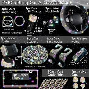 Conjunto de acessórios de carro Bling multicoloridos de 27 peças NBTEPEM para mulheres, capas de volante Bling, ajuste universal de 15 polegadas, moldura de matrícula Bling, suporte para telefone Bling, porta-copos Bling