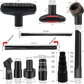 - Kit universal de acessórios de vácuo de 15 unidades: adaptador de mangueira de vácuo de 3 × 1/2" a 1 1/4", adaptador de mangueira de vácuo de 1 × 7/8" a 1 3/8" a 1 1/4" e 1 3/8" a 1 1/4", acessório de escova a vácuo de 1 × 12" de largura, escova de pó de crina de cavalo de 1 × 1/4", ferramenta de fenda flexível de 1 × 1/4", ferramenta de fenda a vácuo de 1 × 1/4", Acessório de ferramenta de estofamento de 1 × 1/4", bocal utilitário de 1 × 1/4" com escova de plástico removível, escova empoeirada de 1 × 1/4", ferramenta combinada de escova e bico de 1 × 1/4", tubo de extensão a vácuo de 3 ×.