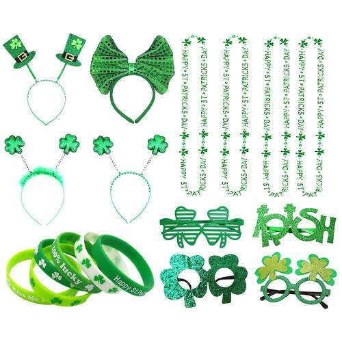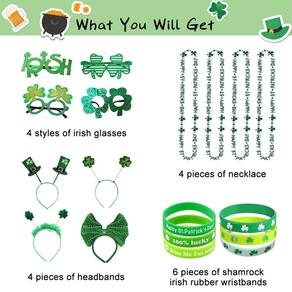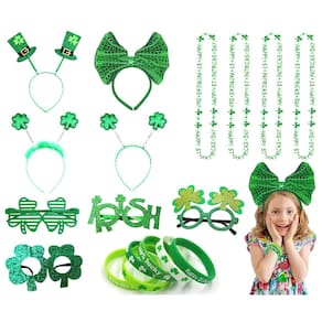 - St. Acessórios de fantasia de festa do dia de São Patrício: um pacote satisfaz todas as suas necessidades ao mesmo tempo! Lembranças de festa do Dia de São Patrício para crianças, incluindo 4 estilos de óculos irlandeses, 4 peças de tiaras, 4 peças de colar e 6 pulseiras de borracha irlandesa trevo. Estes acessórios de fantasia são um grande sucesso para a celebração do Dia de São Patrício e as crianças definitivamente vão adorar!