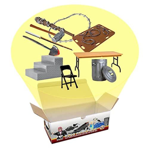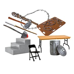 Inclui os seguintes 10 itens hardcore: mesa quebrável, lata de lixo, cadeira dobrável, degrau de anel, pá sangrenta, bastão de kendo, marreta, bastão de arame farpado, peça de arame farpado e tábua de arame farpado. Perfeito para o fã de wrestling que coleciona figuras de ação!