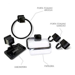 Aproveite para comprar seu Kit Banheiro com 5 Peças na cor Preta e transforme o seu banheiro em um ambiente mais elegante e organizado!Kit Banheiro com 5 Peças - perfeito para deixar seu banheiro mais organizado e elegante. Feito em polipropileno na cor Preta, este kit é resistente e durável, garantindo a qualidade que você procura. O kit acompanha 1 saboneteira, 1 porta toalhas argola, 2 porta toalhas gancho simples e 1 papeleira, tudo o que você precisa para manter seu banheiro organizado. Além disso, é fácil de instalar com os 5 parafusos e 5 buchas inclusos. Adquira já o seu Kit para Banheiro com 5 Peças na cor Preta e transforme o seu banheiro!Dicas de Uso: