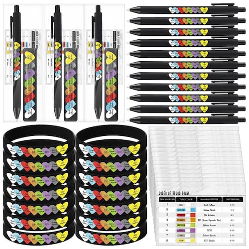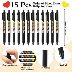 Obtenha mais por menos com este pacote de acessórios inclusivo. Vem com 15 canetas esferográficas, 15 cartões de sequência de coleta de sangue e 15 pulseiras de coleta de sangue. Uma oferta completa que poupa a agitação de compras individuais.