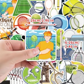 Material: papel e vinil Peso: 30-60 g Tamanho: 3-6 cm Quantidade: 50 unidades Adesivos de tênis PCS: inclui uma variedade de designs exclusivos com bolas de tênis, raquetes, silhuetas e citações divertidas. Perfeito para entusiastas do tênis. Duráveis e impermeáveis: feitos com material de vinil de alta qualidade, esses adesivos são à prova d'água, resistentes a arranhões e adequados para uso interno e externo. Perfeito para personalizar equipamentos: ideal para decorar garrafas de água, laptops, capas de telefone, malas, skates e muito mais, perfeito para atletas e fãs de esportes. Fácil de aplicar e remover: esses adesivos são simples de aplicar e remover sem deixar resíduos pegajosos, o que os torna ideais para decoração temporária. Designs divertidos e motivacionais: mostre seu amor pelo tênis com esses designs divertidos, coloridos e motivacionais que inspiram os atletas a continuarem jogando.