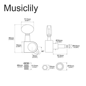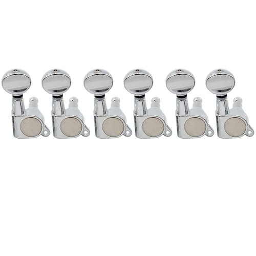Musiclily 6 afinadores de guitarra selados em linha, pinos de afinação, chaves, conjunto de cabeças de máquina para substituição de guitarra elétrica Strat Tele, botão de rim cromado - Máquinas de afinação seladas para guitarra elétrica Strat e Tele - Serve para furos padrão de 10 mm, tamanho da cabeça de 18 mm de largura - Matéria: liga metálica; Cor: cromado; Relação de engrenagem 15: 1 - Conjunto de 15 cm em linha; botão chaveiro, porca, virola, parafusos incluídos - Incluído no pacote: 6 peças de teclas de afinação de guitarra